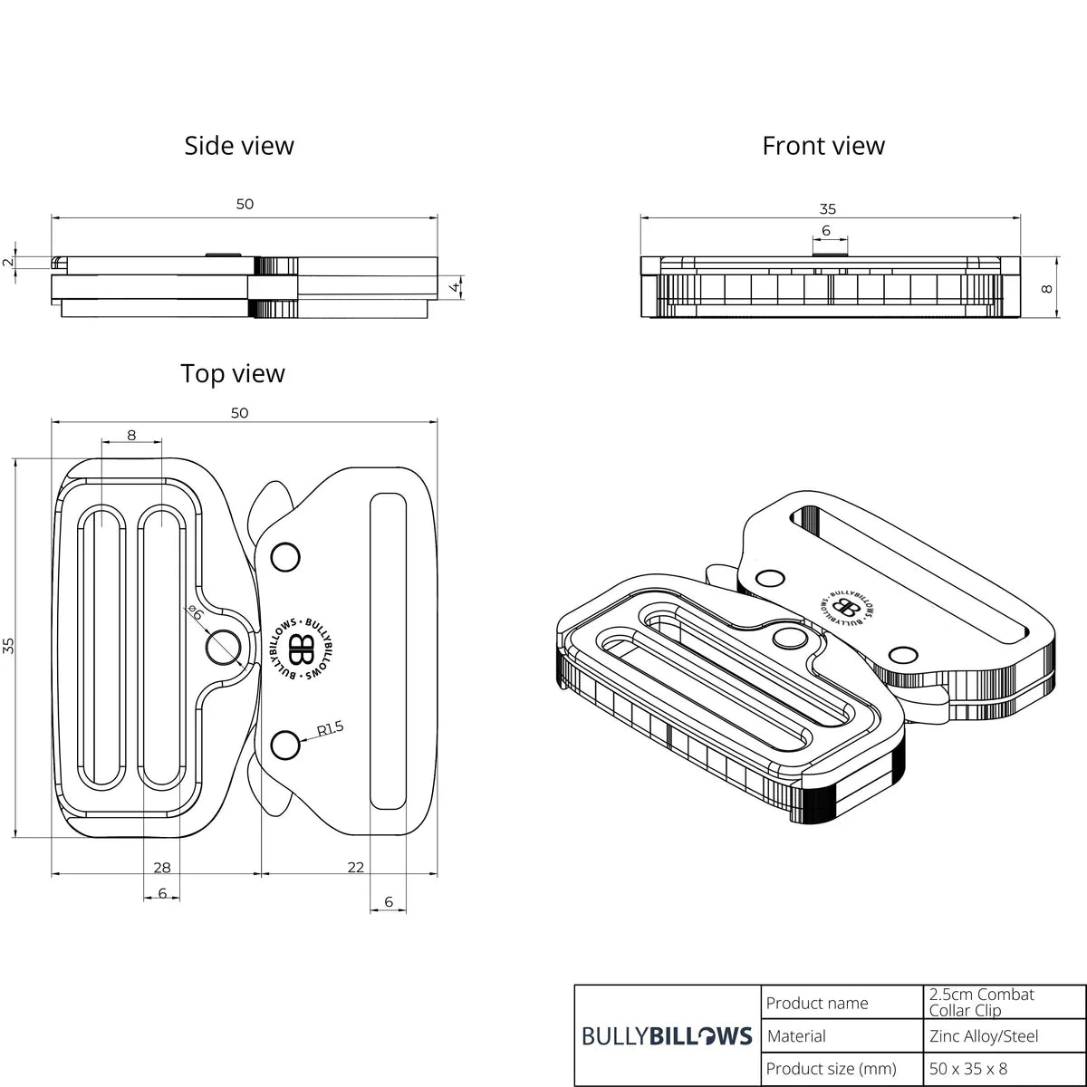 The original BullyBillows 2.5cm Combat Collar is the first of its kind in the world. This collar features triple-stitched nylon, a secure 4mm wide Aluminium Alloy D Loop, and a specially crafted bespoke clip for quick release and locking.