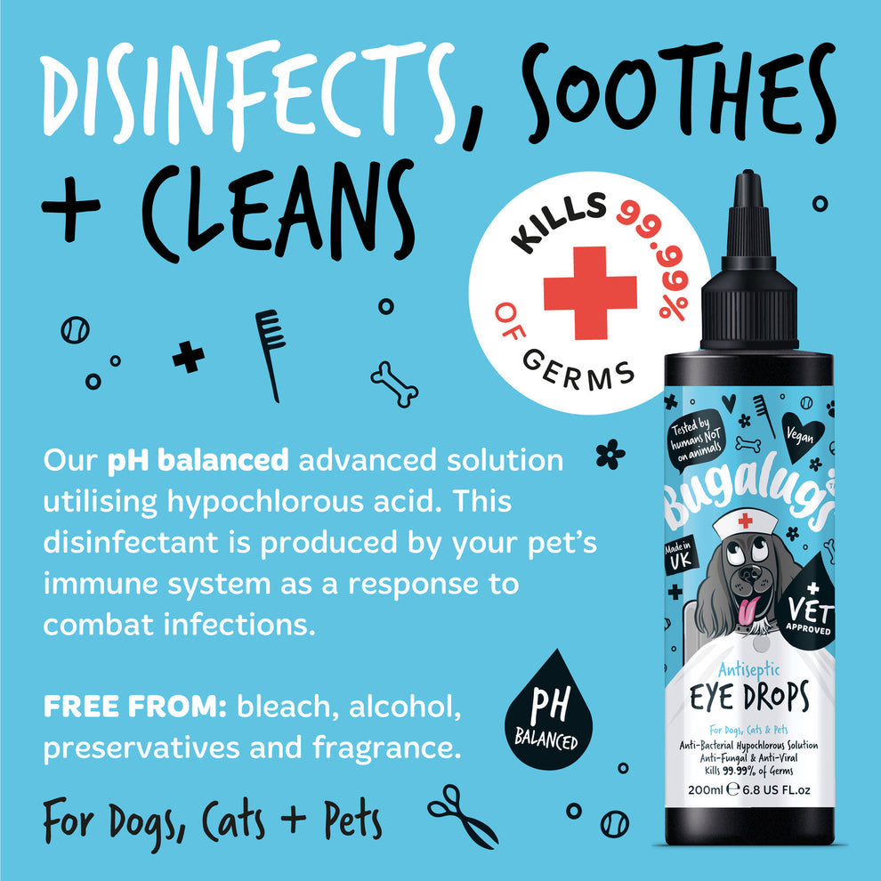 Bugalugs Antiseptic Eye Drops is a clinically proven advanced solution utilising hypochlorous acid, nature’s disinfectant that is produced by your pet’s immune system as a natural response to combat infections. Dermatologically tested and hypoallergic, our natural anti-bacterial, anti-viral and anti-fungal eye drops are non-irritating, yet powerful enough to kill all types of harmful pathogens and 99.99% of germs. Flush out and relieve eyes irritated by pollutants and contaminants with our antiseptic, pH balanced formula that contains no alcohol, preservatives or fragrance. Suitable for use on dogs, cats, horses, birds and all other small animals.• Irritated eyes• Eye secretions• Dry & swollen eyes• Soothing formula• Cleansing antisepticApprovals:Complies with UK BPR & EU 528/2012. Approved Veterinary use. Independently tested to the following standards EN 13697, EN 1656, EN 1276, EN 13704, EN 14476, EN14204, EN13727 & EN1650. Compliant for veterinary Biocidal use.