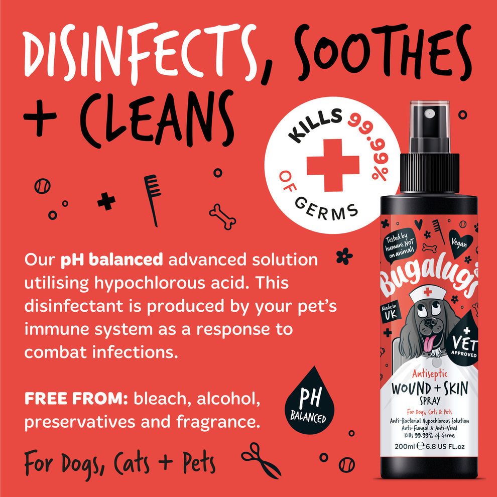 Bugalugs Antiseptic Wound & Skin Spray is a clinically proven advanced formula utilising hypochlorous acid, nature’s disinfectant that is produced by your pet’s immune system as a natural response to combat infections. Dermatologically tested and Hypoallergenic, our anti-bacterial, anti-viral and anti-fungal spray is gentle on skin, yet potent enough to kill all types of harmful pathogens and 99.99% of germs. This pH balanced spray is a natural antiseptic and contains no alcohol, preservatives or fragrance. Can be used around mouth, ears, nose and sensitive areas. Suitable for use on dogs, cats, horses, birds, reptiles and all other small animals.• Skin disinfection• Cuts and grazes• Minor wounds• Insect bites• Post-surgery wound care Approvals:Complies with UK BPR & EU 528/2012. Approved Veterinary use. Independently tested to the following standards EN 13697, EN 1656, EN 1276, EN 13704, EN 14476, EN14204, EN13727 & EN1650. Compliant for veterinary Biocidal use.
