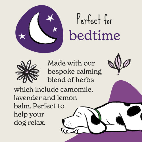 Our canine calming treats are perfect for moments when you need a bit of peace or before bedtime to help your dog settle. These soft, semi-moist relaxing dog treats are packed with natural ingredients, free from grains, artificial colours, and preservatives.
