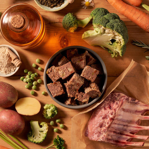 Lamb Shepherd's Pie - Lamb (75%)*, Broccoli (2%)*, Peas (2%)*, Dried Potato (1.5%, equivalent to 6%)*, Dried Carrots (0.5%, equivalent to 4%)*, Minerals, Linseed Oil (0.5%)*, Dried Herbs (Parsley, Rosemary, Nettle, Camomile) (0.12%)*, Chicory Root Extract (0.05%)*, Yucca Extract (0.005%)*. *Natural ingredient