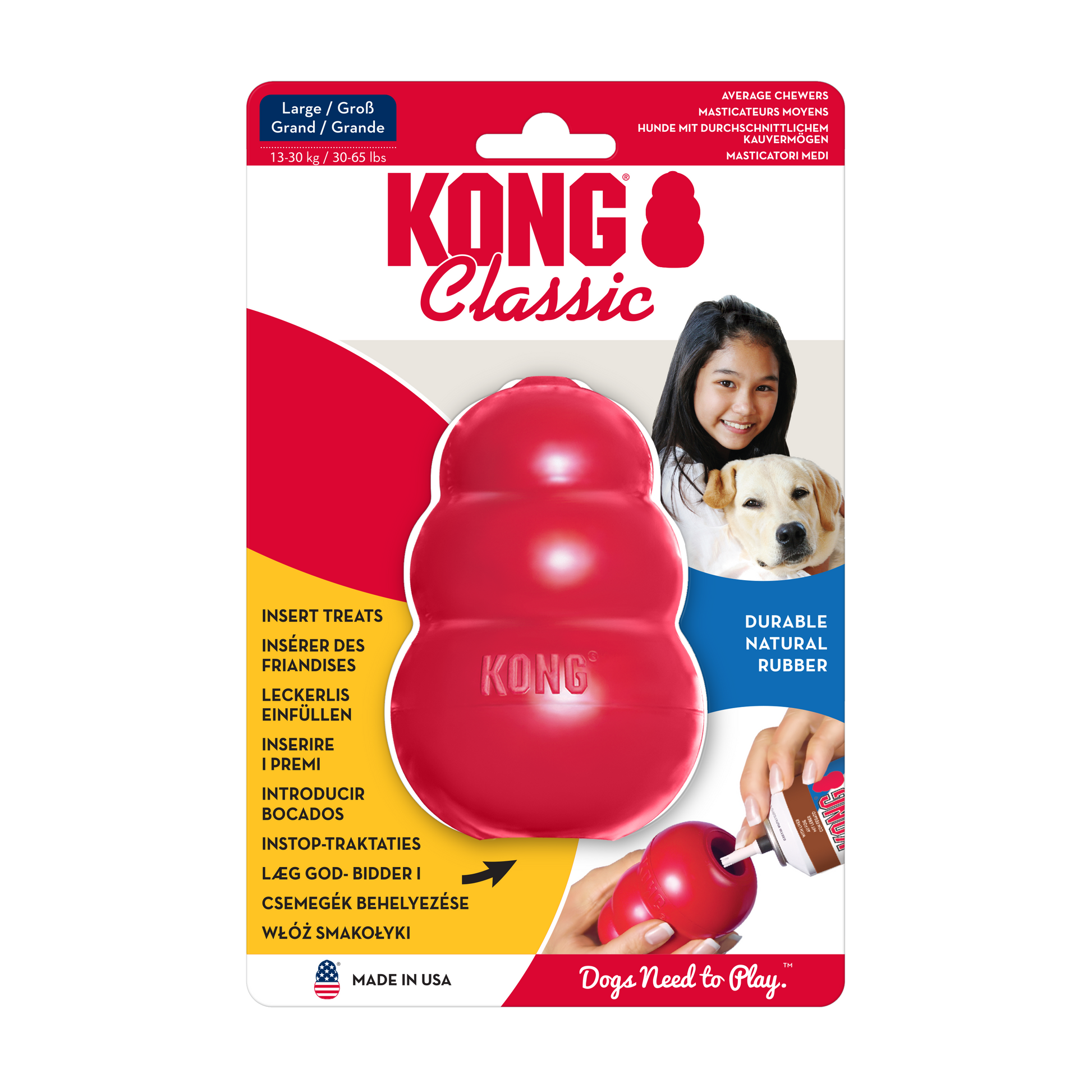 •Mentally stimulating toy; offering enrichment by helping satisfy dogs instinctual needs •KONG classic red rubber formula for average chewers •Unpredictable bounce for games of fetch •Great for stuffing with KONG Easy Treat; Snacks or Ziggies •Recommended by veterinarians and trainers worldwide •Natural rubber •Freeze with your dog's favorite tastes for extended play •Available in six sizes: XS, S, M, L, XL and XXL