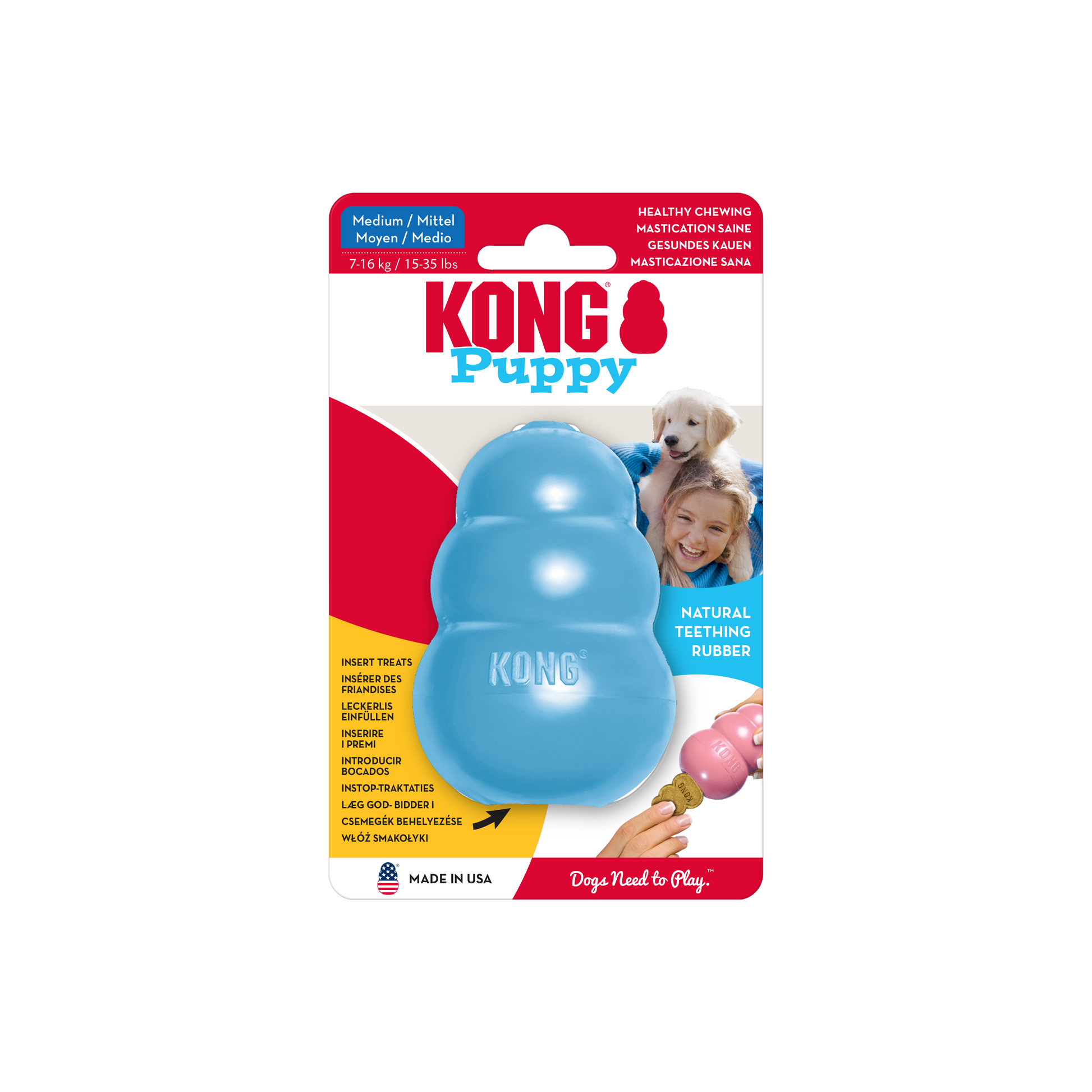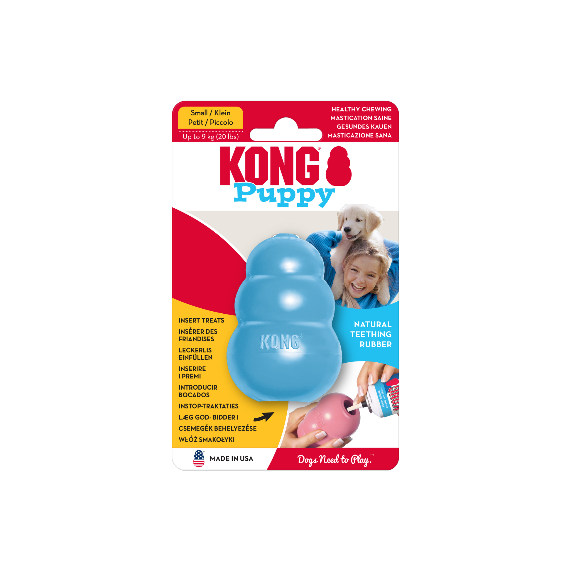 •Teaches appropriate chewing behavior while offering mental enrichment •Soft puppy KONG rubber formula is customized for puppy teeth and gums •Unpredictable bounce for games of fetch •Great for stuffing with KONG Puppy Easy Treat; Snacks or Ziggies •Recommended by veterinarians and trainers worldwide •Natural rubber •Freeze with your puppy's favorite tastes for extended play •Assorted Pink and blue colors available in four sizes: XS, S, M and L