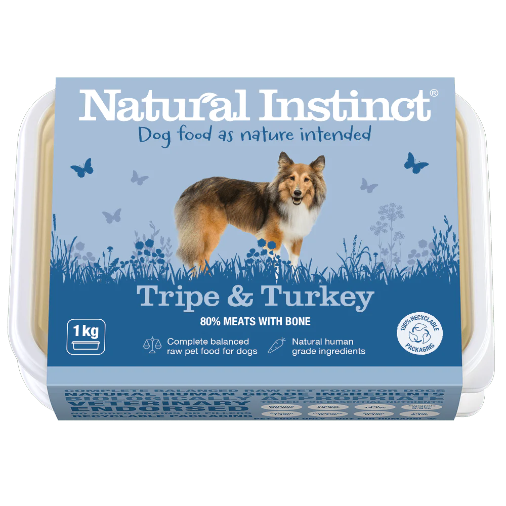 Natural Instinct's Natural Tripe & Turkey is a complete and balanced raw dog food and a firm favourite amongst our customers. Made using beef green tripe (40%), turkey with bone (40%), vegetables and fruits, this frozen, tasty meal is an excellent choice for your dog, especially those fussy eaters, as the green tripe is too irresistible to miss.