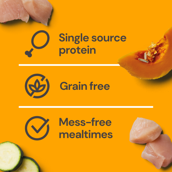 Chicken 85% (Muscle Meat, Meaty Back, Gizzard, Skin, Hearts), Pumpkin, Courgette, Chicory, Algae Oil, Minerals